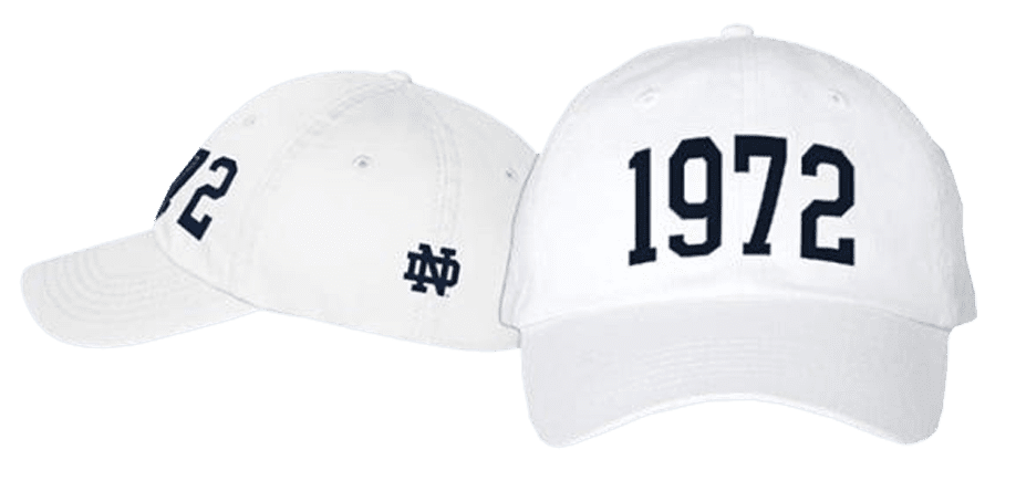 The 1972 Hat was created to honor a pivotal moment in the University of Notre Dame’s History, the decision to move to co-education and admit female undergraduate students in 1972. Available exclusively at the Hammes Notre Dame Bookstore and online, the hat supports the Hesburgh Women of Impact Initiative.